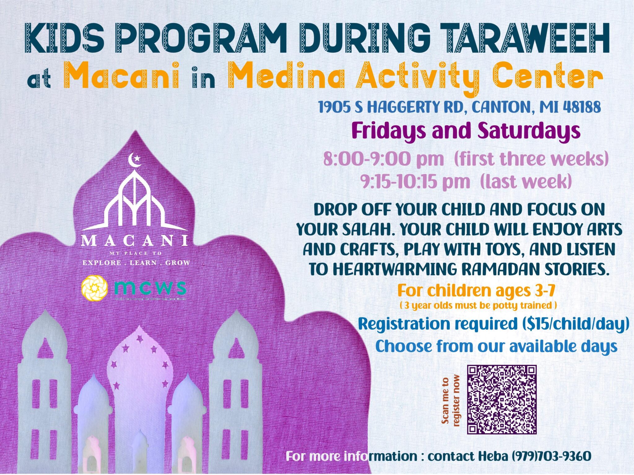 While you find your focus during Taraweeh, let your little ones (ages 3โ7) enjoy a night of joy at Macani. Our drop-off program at Medina Activity Center offers a fun-filled hour of:โขย Inspiring Ramadan storiesโขย Creative arts & craftsโขย Supervised playtimeEnjoy your prayer with peace of mind knowing theyโre falling in love with the masjid too!โ